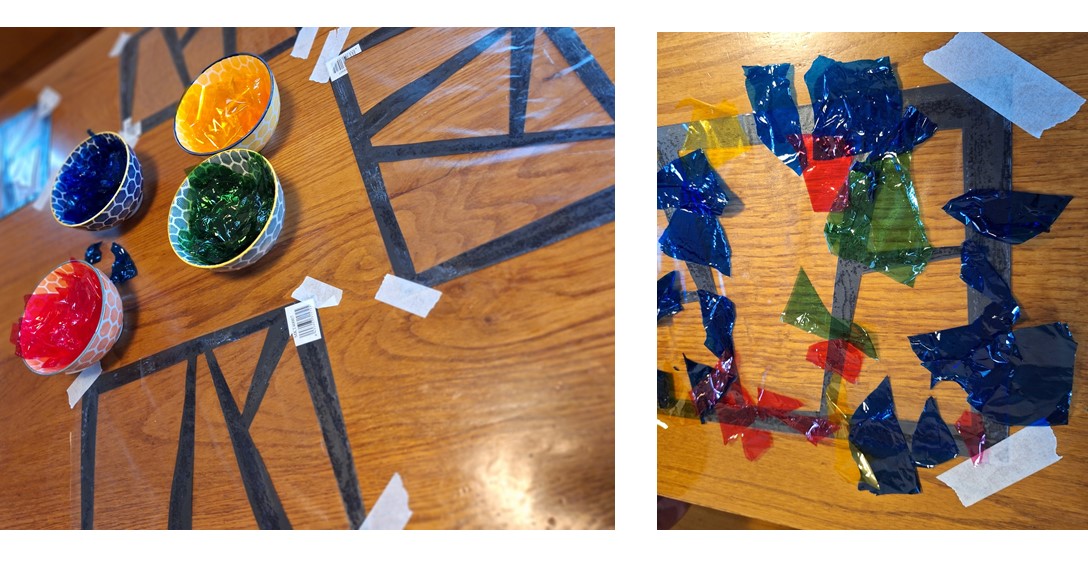 Kartulina moztu, koloretako paper zeharargi pusketak prestatu eta plastiko itsaskorraren gainean jarri.