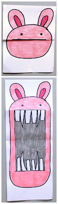 Etxeko lanetan ez da dena idaztea eta irakurtzea izango. Hemen marrazki berezi bat egiteko proposamena. Aurrena orria lau zati berdin lortzeko tolestu behar da eta nahi dugun animalia edo pertsonaren buruaren marrazkia egin (ahorik gabe). Gero zabaldu orria eta falta den zatia osatu (aho zuloa eta hortzak).